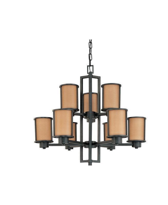 Aged Bronze 9 Light Hanging Chandelier With Biscotti Glass.